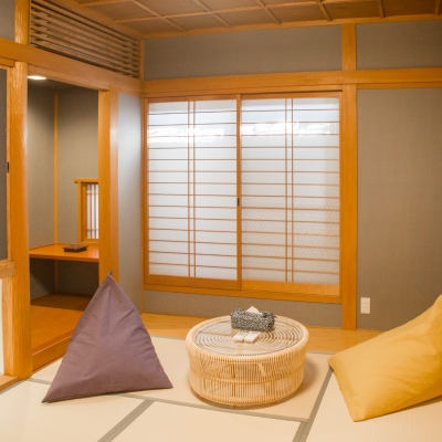 寝室は2つ。リビングに隣接するお部屋にはちょっぴりモダンなダブルベッドを1台。もうひとつの和室には3組のお布団でお休みいただけます。朝は障子を通した優しい光でお目覚めください。