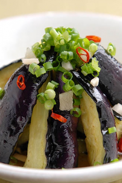 揚げ茄子のニンニクソースかけ